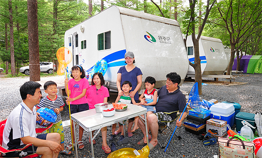 어린 자녀를 둔 부모들이 저렴한 비용으로 여름 휴가를 보낼 수 있는 곳, 완주군 고산면 오산리 산43-1번지 일대 '고산 자연휴양림'에 있는 카라반(caravane)이다.