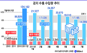 하지만 김치 수입량은 작년 7월까지 9만6천826t에서 올해 7월까지는 13만4천162t으로 38.6%나 크게 늘어났다.