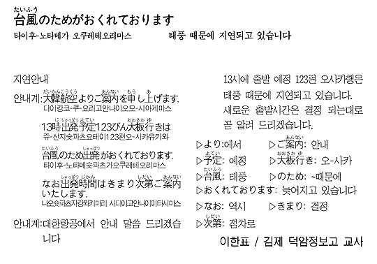 [회화 삼국지] 관광 일본어 - 태풍 때문에 지연되고 있습니다