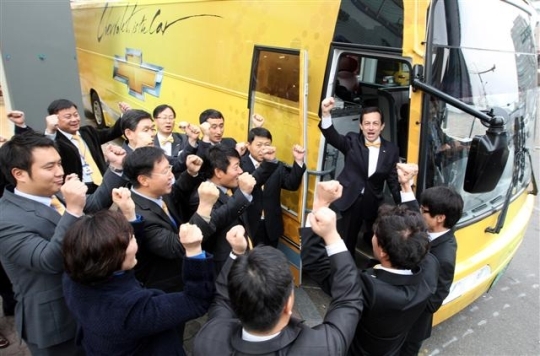 한국지엠 마이크 아카몬 사장과 영업, 마케팅, 디자인, 기술개발 등 각 부문 부사장 등 20여명의 경영진은 15일 인천을 시작으로 서울, 대전, 군산, 부산, 창원시를 방문해 우수 대리점을 시상하고 터미널, 역 등에서 새해 달력을 배포한다.