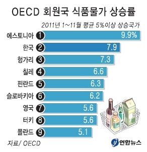5일 OECD 통계를 보면 2011년 1∼11월까지 한국의 식품물가 상승률은 7.9%를 기록했다. 식품물가란 식료품과 비주류음료 물가를 의미한다.