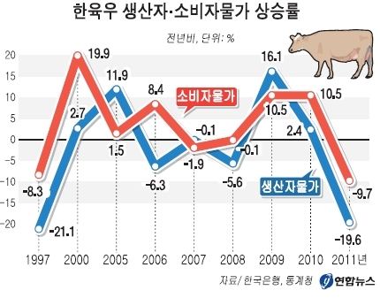 그러나 쇠고기 소비자물가 하락률은 생산자물가 하락률의 절반도 안됐다. 10일 한국은행과 통계청 통계를 보면 지난해 쇠고기 생산자물가지수는 84.5로 2010년보다 19.6% 급감했다. 한우파동이 있었던 1997년 -21.1% 이후 최저다.