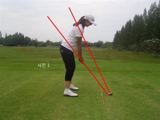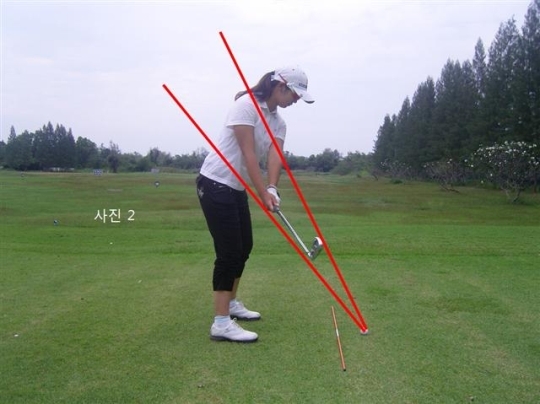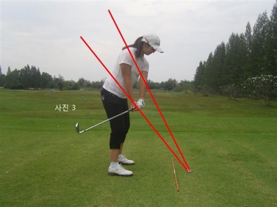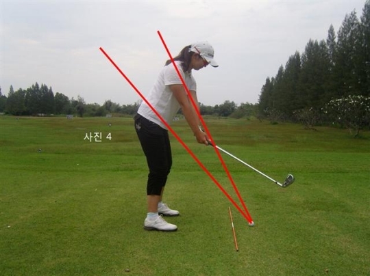 사진②는 바른 동작을 구사했을 때 클럽의 헤드와 샤프트가 두 선의 안쪽으로 머물러 있어서 좋은 스윙을 기대하기 좋다. 반면 ③번과 ④번의 사진은 클럽 헤드의 위치가 잘못된 곳에 위치해 있다는 것을 알 수 있다. 그 이유는 클럽의 헤드가 두 선 밖으로 나가서 위치해 있기 때문이다. 즉 몸통이 돌아가지 않고 손으로만 스윙을 했던지, 손목을 너무 사용하여 스윙을 했던지, 클럽의 헤드의 위치에 따라 스윙 플레인이 바뀐다는 것을 생각하고 정확히 동작을 만들어 내려는 노력이 필요하다.