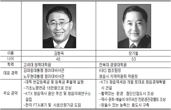 △현역 의원을 이길 수 있는 비책은.(장기철)= 지난18대 총선에서 낙선한 이후 정읍을 떠나지 않고 4년동안 정읍과 민주당을 지키며시민들과 동고동락하며 친숙을 도모하고 참일꾼으로 인식을 심어줬다. 또 KTX 정읍역사 신축 및 지하차도 개설 원안추진을 위한 10여일간의 단식농성을 펼쳐 범시민 궐기대회 및 시민·사회단체 결집을 이끌어 냈다.