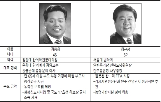 김제·완주 선거구는 두 후보 모두 김제 출신으로, 일단 완주지역 선거인단의 표심을 누가 더 확보하느냐에 따라 승패가 갈릴 것으로 전망된다.