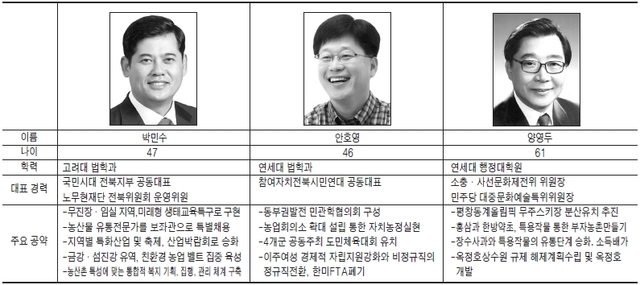 현재 경선 후보는 총 3명. 4개 지자체가 선거구인 지역 특수성을 고려, 진안(안호영)·장수(박민수)·임실(양영두)에 각 한 명씩의 후보가 안배됐다.