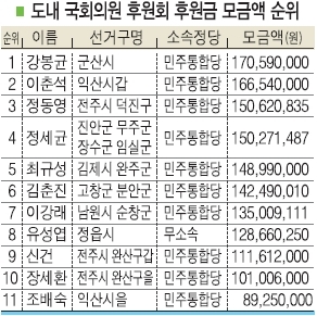 지난해 도내 국회의원 가운데 가장 많은 후원금을 거둔 의원은 강봉균 의원(군산)으로 모두 1억7059만원을 모금했다. 강 의원의 후원금 모금액은 전체 국회의원 가운데 6위에 해당된다.