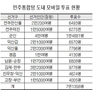 11일 총 5차례에 걸쳐 진행된 모바일 투표 결과, 투표에 참가한 선거인수는 총 7만1358명으로 전체 모바일 투표 선거인단의 60% 안팎에 달한 것으로 추정됐다.