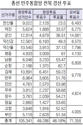 정동영 의원이 서울 강남을로 지역구를 옮긴 전주 덕진에서는 김성주 전 도의원(47)이 이재규 전북 혁신과통합 정치혁신위원장(49)을 도내 10개 선거구 가운데 가장 큰 격차인 69%대 31%로 꺾었다.