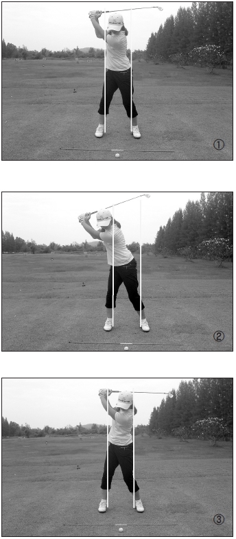 사진 2는 몸통의 회전이 일어나지 않고 몸통이 좌우로 움직이는 동작을 한 것이다. 따라서 몸의 축이 잡히지 않고 좌우로 많이 움직이는 결과를 만들어 내고, 이 동작은 클럽의 스피드를 줄어들게 하며, 임팩트의 정확성을 현저하게 떨어트리는 역할을 한다.