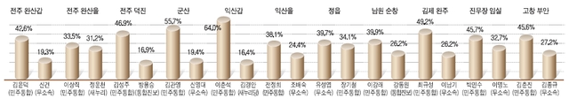 이는 19대 총선 후보자 확정에 따라 전북일보가 도내 언론사 가운데 처음으로 지난 26~27일 이틀간 실시한 '제19대 총선 정치현안 특집조사'결과에 따른 것이다.