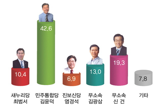 김 후보는 전 연령층과 지역에서 신건 의원을 모두 앞서는 것으로 나타났다. 신 의원은 50대(24.5%)와 60대(24.3%), 제1선거구(22.3%)에서 20%이상 지지를 받는 것으로 조사됐다.
