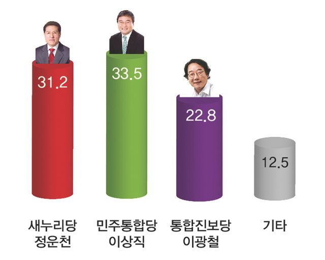 장세환 의원 불출마로 무주공산이 된 완산을은 민주통합당 이상직 후보와 새누리당 정운천 후보가 오차범위내 접전을 벌이고 있다. 새누리당 정운천 후보는 20대(29.0%)와 30대(30.8%)에서 선두를 달렸고, 40대 이상에서는 이상직 후보가 선두를 달리는 것으로 조사됐다.