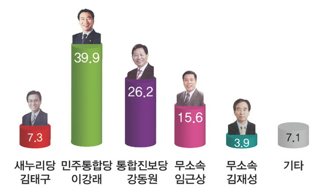 이 의원은 20대(48.9%), 30대(39.7%), 60대(46.2%)에서 강동원 후보를 크게 앞섰고, 40대에서는 이강래·강동원 두 후보가 똑같은 32.0%의 지지를 얻었다. 50대는 강동원 후보가 39.0%의 지지를 얻어 28.6%에 그친 이강래의원을 10.4%포인트 앞섰다. 이에따라 무소속 후보의 단일화가 이 지역 최대 변수가 될 것으로 전망된다.