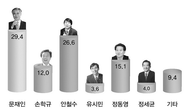 '출마가 예상되는 야권 대선 후보들 중 누구를 지지하느냐'는 질문에 문재인 노무현재단 이사장이 29.4%의 지지를 얻어 26.6%로 추격한 안철수 서울대 교수를 2.8%p 차이로 앞섰다.