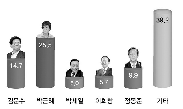 보수진영 대권 주자 가운데는 박근혜 새누리당 비상대책위원장이 25.5%의 지지를 얻어 14.7%에 그친 김문수 경기도지사를 10.8%p 차이로 따돌렸다.