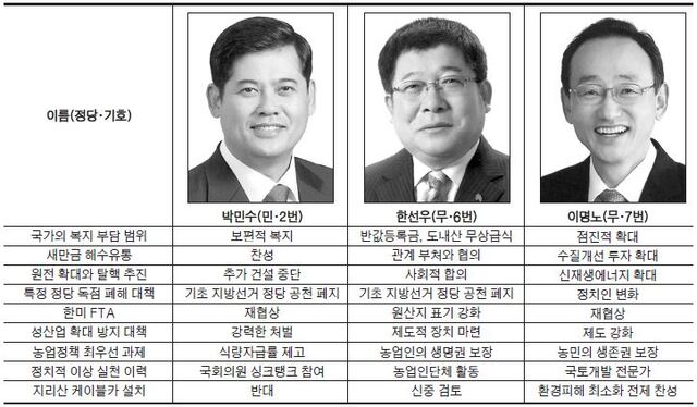△이명노 후보: 도시와 농촌, 부자와 서민, 대기업과 중소기업 등의 세수 형평성 문제가 선행돼 세수를 먼저 확보한 뒤 복지의 범위를 점진적·순차적으로 확대해야 한다.