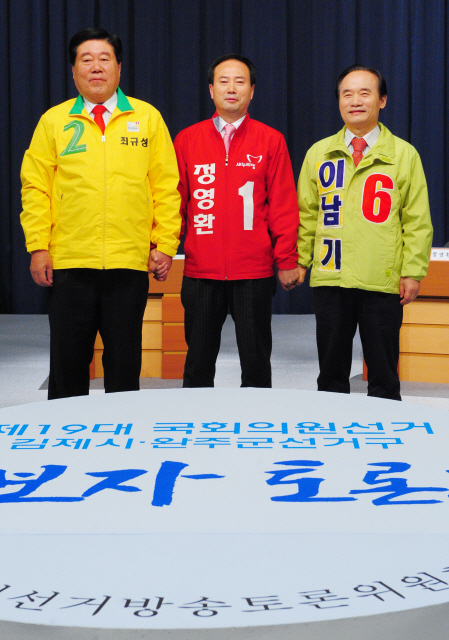 김제시선거방송토론위원회가 주관한 19대 총선 김제·완주 선거구 후보자 토론회가 5일 전주MBC에서 열렸다. 임성진 전주대 교수의 사회로 새누리당 정영환 후보, 민주당 최규성 후보, 무소속 이남기 후보가 참가한 이날 토론회는 후보자 기조발언, 공통질문, 핵심공약 토론, 공통질문, 후보자 주도권 토론, 공통질문, 마무리 발언 순으로 진행됐다. 정 후보는 김제에 쌀 가공산업단지 조성, 농어촌 출신 대학생 학비 지원, 벽골제 복원, 완주군 복합스포츠타운 조성을, 최 후보는 김제 지평선 산업단지 차질없이 추진, 공항부지에 100만평 산업단지 조성, 완주에 추가 90만평 산업단지 조성, 완주로컬푸드 확대 발전, 농업기반시설 확충을, 이 후보는 30만평 규모 현대자동차 제8공장 유치, 항공기 정밀 점검 국제센터 유치, 한미FTA 수혜기업 이익 50% 농업 환원 및 특별법으로 해결, 노인 의료복지시설 확충을 공약으로 내걸었다. 이들 후보는 상대 공약의 허점을 지적하고 과거의 과오를 추궁하는 등 날카로운 신경전을 벌였다.