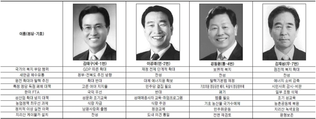 △김태구 후보: GDP 2만달러 시대에 5만달러 복지는 불가하다. 그러나 국민의 GDP 상승에 따른 점진적 복지확대는 필수적이다.