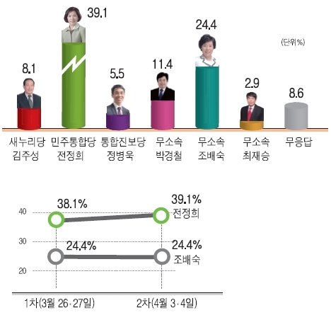 민주통합 전정희, 오차범위 벗어난 격차로 여전히 선두