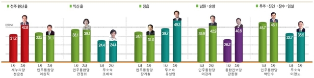 전주 완산을 선거구의 새누리당 정운천 후보가 지지율 40%를 넘어서며 민주통합당 후보를 제치고 선두에 올라선 것으로 나타났다. 남원·순창에서는 민주통합당 이강래 후보와 통합진보당 강동원 후보가 오차범위내에서 초접전을 벌이고 있는 것으로 조사됐다.