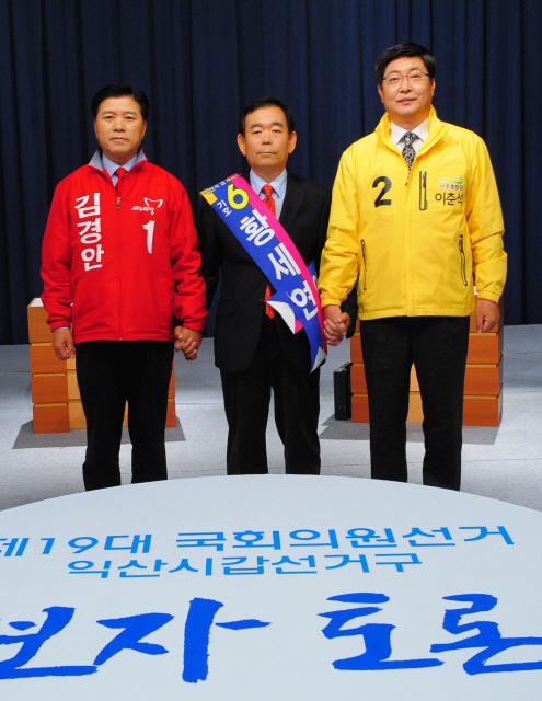 익산시선거방송토론위원회가 주관한 19대 총선 익산 갑선거구 후보자 토론회가 6일 오전 전주MBC에서 열렸다. 임성진 전주대 교수의 사회로 새누리당 김경안 후보와 민주통합당 이춘석 후보, 무소속 황세연 후보가 약80분간 생방송으로 펼친 이날 토론회는 기조발언부터 김 후보는 호남의 여당인 민주당 심판론을 주장했고, 이 후보는 이에 맞서 MB정권 심판론을 강조했다. 황 후보는 토론시작부터 마지막까지 이 후보의 명함에 허위사실이 담겨있다며 집중공세를 펼치는 등 날카로운 신경전이 토론회 내내 펼쳐졌다.