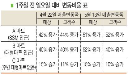 표에 따르면 대형마트 인근의 B 마트의 경우 고객수 증가에 비해 매상 증가가 훨씬 많은 것으로 나타나 1인당 구매량이 많은 대형마트 이용객이 휴무일로 인해 인근 중소마트를 이용한 경향이 확인되고 있다. 아울러 주변에 대형마트가 없는 C 마트의 경우도 대형마트 휴무에 따른 분명한 매상증가를 보여준다.