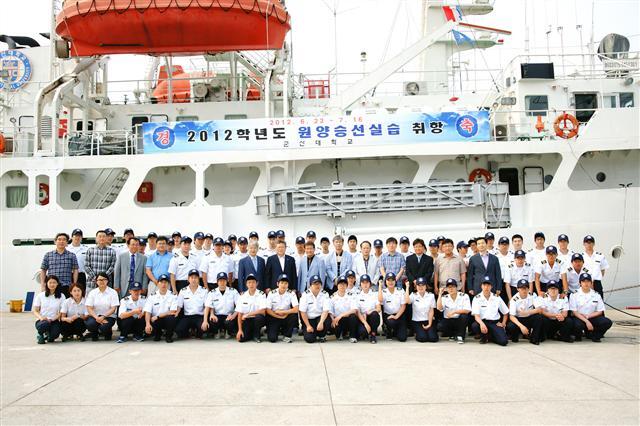 군산대학교 해양과학대학(학장 이정열) 학생 80여명이 지난 22일 원양승선실습 출항식을 갖고 25일간의 항해에 나섰다. 해양생산학과와 동력기계시스템공학과 등 관련학과 학생 및 지도교수, 승무원, 교직원 등 80명은 이날 군산 역무선 부두에서 채정룡 총장을 비롯하여 김명준 선박실습운영센터장, 승무원, 가족 등이 참석한 가운데 출항식을 갖고 다음달 16일까지 원양승선실습에 들어갔다. 이번 실습은 1424톤급 실습선 해림호에 승선해 26일 시모노세끼항, 7월2일 나가사끼항, 7월 10일 청도항에 기항해 수·해양 기관을 예방하고 수해양대학 및 연구시설 등을 견학해 학술교류 및 상호우호 증진을 위한 활동을 하게 된다.