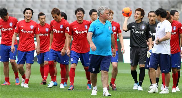 2012 K리그 올스타전을 하루 앞둔 4일 오후 서울월드컵경기장에서 히딩크 감독이 팀2002 선수들과 훈련하고 있다. 한일 월드컵 개최 10주년을 기념해 열리는 이번 올스타전은 한일월드컵에 나섰던 선수들로 구성된 '팀 2002'와 K리그 팬들의 투표로 선정된 '팀 2012'의 경기로 열린다. 연합뉴스