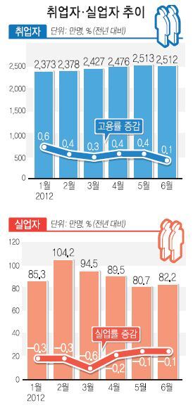 취업자 증가 폭은 지난 2월 44만7천명, 3월 41만9천명, 4월 45만5천명, 5월 47만2천명으로 늘다가 6월 들어 40만명 아래로 뚝 떨어졌다. 6월 취업자 증가 폭은 작년 9월의 26만4천명 이후 가장 적다.