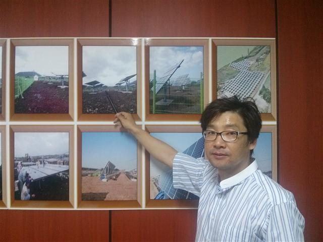 | ▲ (유)N.E.D 김용완 대표가 열추적 센서와 풍속센서가 부착된 태양광 시스템 제품의 장점을 설명하고 있다. | ||