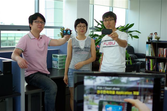 | ▲ (주)나인이즈 조용로 대표(왼쪽)가 김연희 차장 및 진명수 이사와 함께 새로 개발할 어플에 대해 설명하고 있다. 이강모기자 kangmo518@ | ||