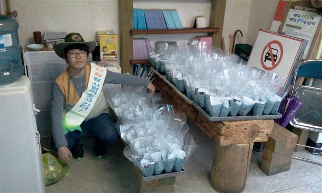 ▲ 서경범군이 버려진 일회용 종이컵을 모아 정성껏 만든 허브화분을 지리산 관광객들에게 나눠주기 위해 준비하고 있다.