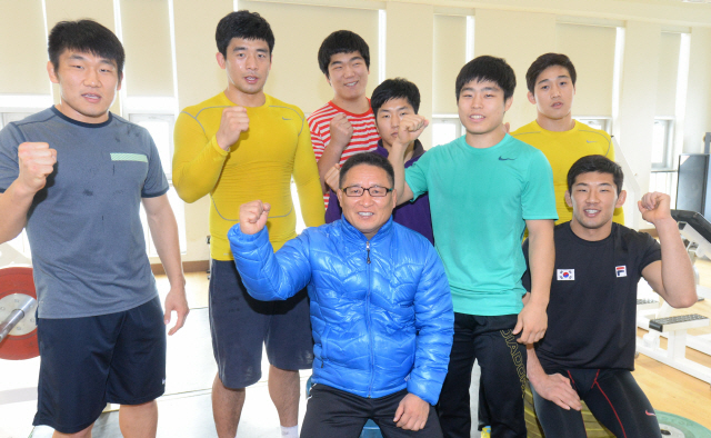 ▲ 전북체육회관에서 권덕용 전북도청 레슬링 감독과 선수들이 화이팅을 외치고 있다. 추성수기자chss78@