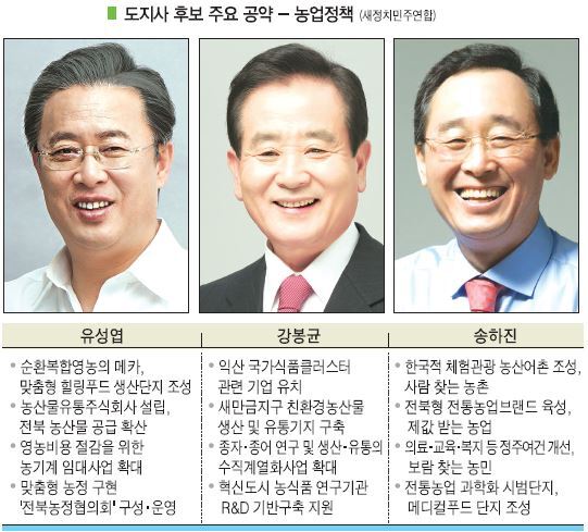 세 후보 모두 농업을 핵심공약으로 내세우고 있다. 지난 민선5기 도지사 선거 당시 전북농업의 경쟁력 강화라는 인식에서 정책공약화가 이루어진 것과는 사뭇 다르다. 농촌진흥청 등의 전북혁신도시, 익산 국가식품클러스터 조성 등 전북의 대내·외 여건이 변화한 탓이다.