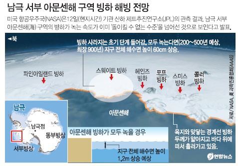 레이더 관측위성을 이용해 이 문제를 연구해온 리그노 교수는 “남극 서부의 이 구역(아문센해) 빙하가 사라지는 것은 막을 수 없는 일로 보인다”고 설명했다. 연합뉴스