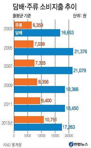 2003년 6359원이었던 가구당 월평균 주류 소비는 2004년 7002원, 2009년 8356원, 2010년 9021원, 2011년 9400원, 2012년 9779원, 2013년 1만751원 등 10년간 매년 늘었다.