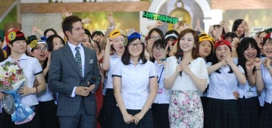 ▲ 지난 27일 전북여고 강당에서 진행된 KBS 1TV ‘도전골든벨’에서 3학년 김희주 학생(가운데)이 프로그램 사상 100번째로 골든벨을 울렸다.