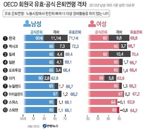 2일 OECD에 따르면 2012년 기준으로 한국 남성의 유효 은퇴연령은 평균 71.1세로 멕시코(72.3세)에 이어 2위였다. 여성은 평균 69.8세로 칠레(70.4세)에 이어 역시 2위를 차지했다. 연합뉴스