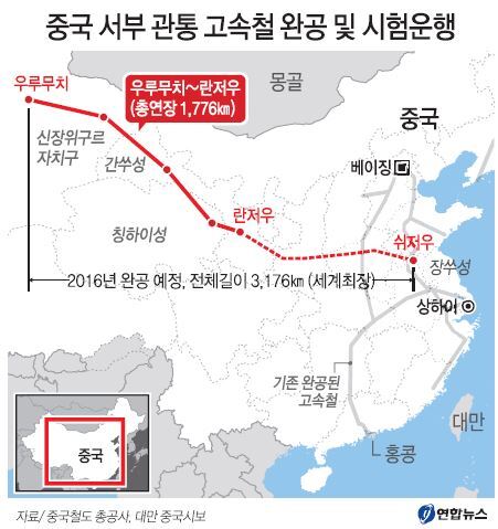 중국철도 총공사는 간쑤(甘肅)성 란저우(蘭州)와 신장(新疆)위구르자치구 우루무치(烏魯木齊)를 연결하는 총 연장 1776㎞의 고속철도를 건설, 3일부터 시험 운행에 들어갔다고 대만 중국시보 인터넷망이 전했다. 정식 개통은 올해 연말 이뤄질 예정이다. 연합뉴스