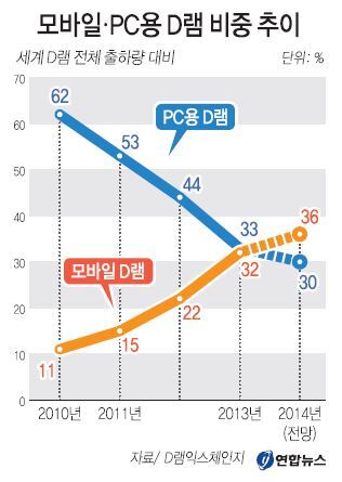 스마트폰과 태블릿PC에 쓰이는 모바일 D램 비중이PC용 D램을 앞질렀다.