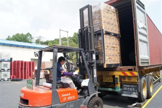 ▲ 친환경 생활용품을 제조하는 아주실업 지게차 요원이 일본 수출길에 오를 컨테이너 적재 작업을 하고 있다.