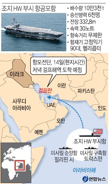 미국 국방부 대변인 존 커비 해군소장은 이날 “이라크에 있는 미국인의 생명과 이익을 보호하는 데 군사작전이 필요하다면 이번 항모 이동 명령으로 총사령관(버락오바마 대통령)의 선택 폭이 넓어질 것”이라고 말했다. 6000명의 병력이 승선한 조지 HW 부시 함은 아라비아해 북부에서 대기 중이었다.