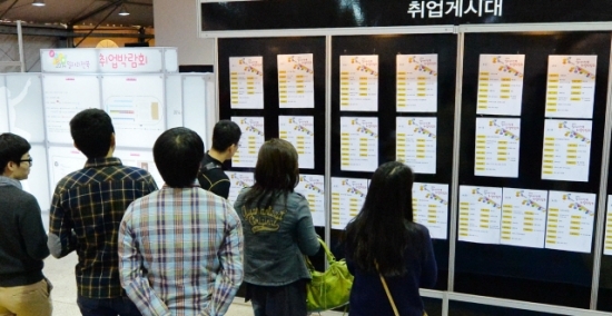 | ▲ 도내 한 대학교에서 구직자들이 일자리를 찾기 위해 취업게시대를 보고 있다. | ||