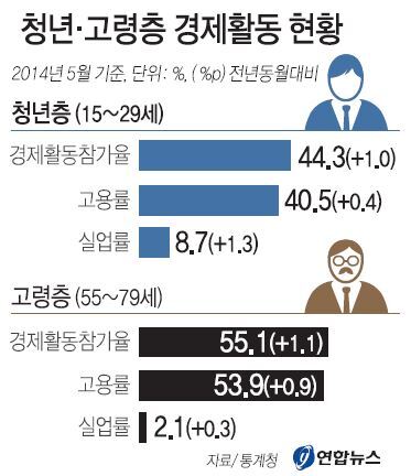 고령층(55~79) 인구는 1137만8000명으로 경제활동참가율은 55.1%, 고용률은 53.9%였다. 가장 오래 근무한 일자리에서의 평균 근속기간은 15년4개월(남 19년, 여자는 11년7개월)로 1년전보다 6개월 줄었다. 연합뉴스