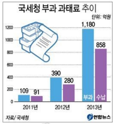17일 국세청과 국회 예결위에 따르면 지난해 국세청이 부과한 과태료는 1180억원으로 전년의 390억원에 비해 200% 가량 늘었다. 2011년에는 109억원을 부과했다. 과태료 수납액도 2011년 91억원에서 2012년에는 280억원, 2013년에는 858억원으로 매년 크게 늘었다.