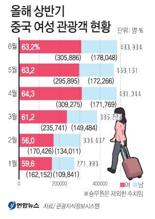 여성 중국 관광객 수는 올해 초인 지난 1월 16만2천명에서 6월 30만5000명으로 급증했다. 이는 같은 달 전체 일본 관광객 수(17만3000명)의 갑절에 가까운 규모다.