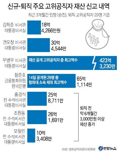 이날 재산이 공개된 고위공직자 29명 가운데 최고 자산가는 우병우 민정비서관으로 예금, 부동산, 사인 간 채권 등 423억3230만원을 신고했다. 연합뉴스