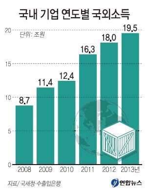 14일 정의당 박원석 의원이 국세청으로부터 제출받은 자료를 보면 국내법인의 국외원천 소득은 2008년 8조7601억원, 2009년 11조4446억원, 2010년 12조4226억원, 2011년 16조3600억원, 2012년 18조999억원, 2013년 19조5233억원으로 매년 증가했다.