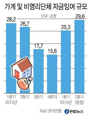 금융기관에서 가계가 빌린 돈은 2분기 15조5000억원으로 전분기(3조3000억원)보다크게 늘었다.